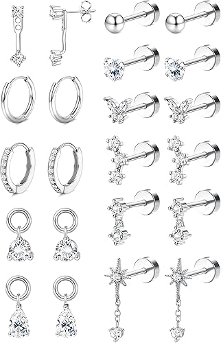 BESTEEL Hypoallergenic Silver Flat Back Earrings for Women - 14K Gold Plated Surgical Stainless Steel Earring Stacks Set | Small Stud & Hoop for Cartilage Helix Tragus Piercing Jewelry Comfort Gift