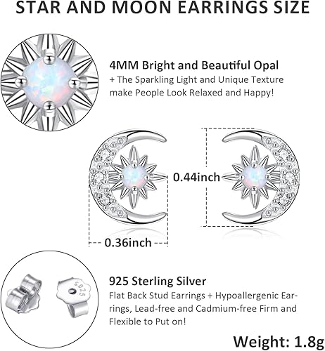 Moon and Star Earrings 925 Sterling Silver Opal Stud Earrings for Women - Hypoallergenic Sun and Crescent Moon Jewelry Gift for Sensitive Ears