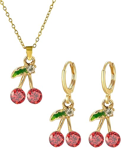 Dreuyet Red Crystal Cherry Earrings Necklace Set for Women Personalized Creative Cherry Fruit Huggies Hoop Earring Pendant Necklace Cute Summer Tropical Fruit Green Leaf Charm Jewelry