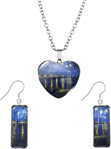 Heart Shaped Van Gogh Starry Sky Sunflower Pendant Necklace Earring Set for Women Jewelry Art Oil Painting Starry Night Rectangular Glass Drop Dangle Earrings