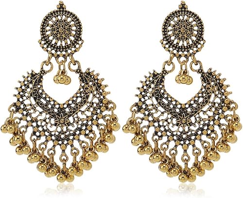 Boho Ball Tassel Statement Dangle Earrings for Women Girls Vintage Flower Heart Shaped Beaded Chandelier Drop Dangling Earring Indian Bollywood Jewelry Gifts for Jhumka Festival Holiday Christmas
