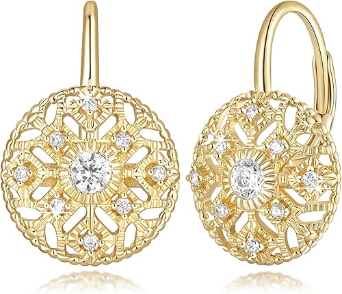 Eloqueen 14K Gold Drop Earrings Dangle Earrings for Women Leverback Dangle with Cubic Zirconia with Engraved Details 14K Gold Earring for Women