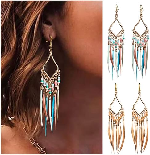 Boho Earrings Set - multicolor bead bohemian earring with cute colorful bead and feather tassel,vintage hollow earring, make you more charming and elegance.