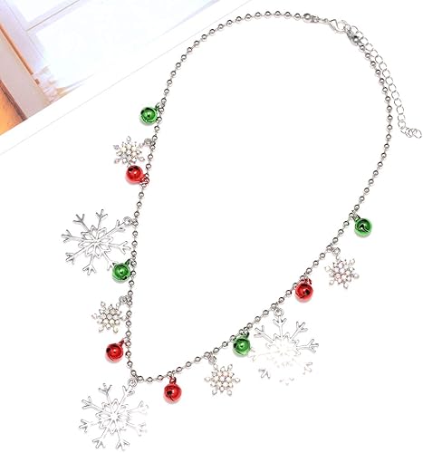 Snowflake Necklace: Our latest statement piece features this fashion jewelry set that includes a chain necklace with snowflake novelty pendant, a pair of drop dangle earrings snowflake shape in silvertone finish. Christmas Necklace along with round beads in red, green, finish with Snowflake/JOY pendant to make up this wonderful magical necklace.