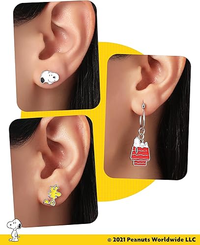 Officially Licensed Peanuts Jewelry for Women: Change up your Peanuts earrings with your mood or outfit thanks to this collection of 3 stud earrings and 3 hoop earrings. All fashion earrings showcase either Snoopy, Woodstock, or Snoopy's doghouse