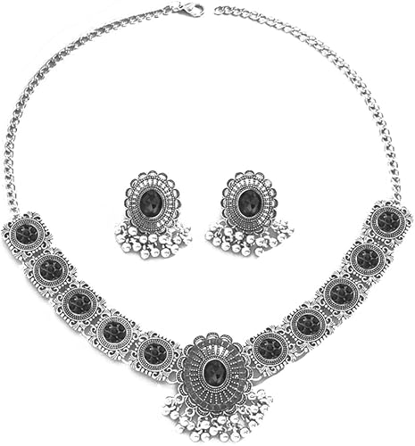 Size: Earring 3.7*3 cm. Necklace 48 cm/ 18.89 inch(Adjustable). Modern but ethnic style oxidized silver plated multifunctional antique tribal designer choked loop necklace set, fashionable modern edge style. Perfect match with various traditional clothing